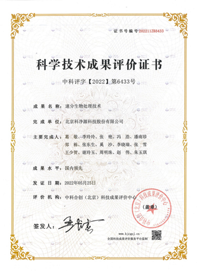 2022年5月20日,北京科凈源科技股份有限公司“速分生物處理技術(shù)”取得科學(xué)技術(shù)成果評(píng)價(jià)證書。